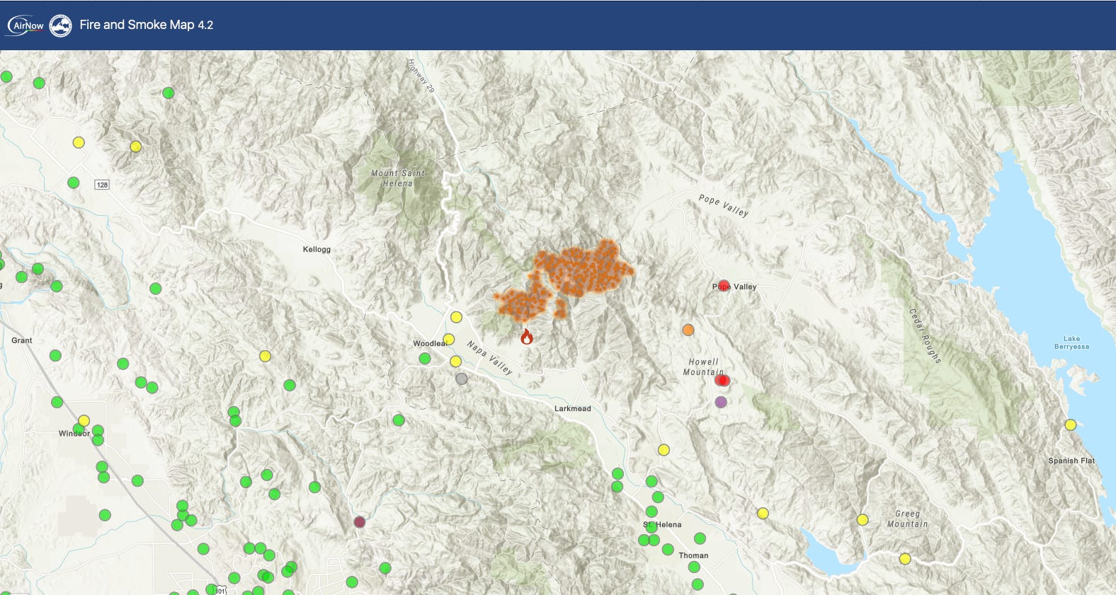 According to The New York Times, the fire nearly doubled in size overnight, spreading southeast but continuing to move away from downtown Calistoga. The area under mandatory evacuation includes about 72 residents, with another 474 under warnings, based on population data analyzed by the Times. No injuries or structure losses have been reported.