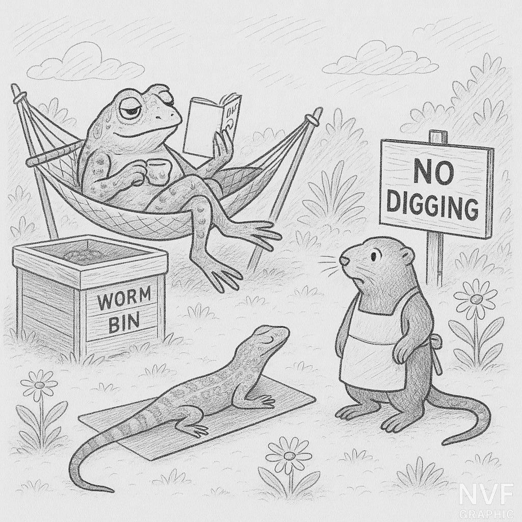 I like these residents of my garden. I talk to them when I am outside, and they come check me out. The toads and frogs seem to like living in my worm bins. I hope they are there to eat fruit flies and not my worms.