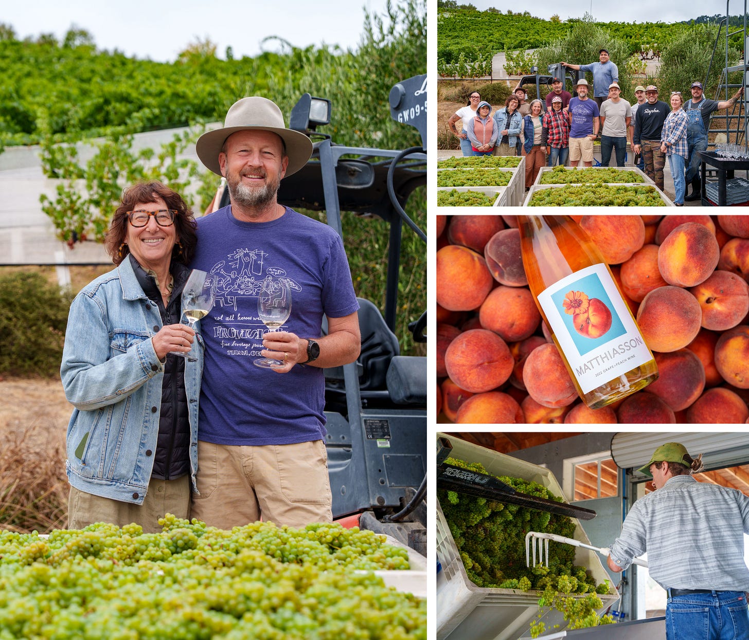 This first pick is destined for two wines: a méthode traditionnelle sparkling chardonnay and a low-alcohol sparkling peach wine the Matthiassons created in 2020 as a COVID-era pivot when restaurants stopped buying their fruit. The peaches come from their orchards on Big Ranch Road.