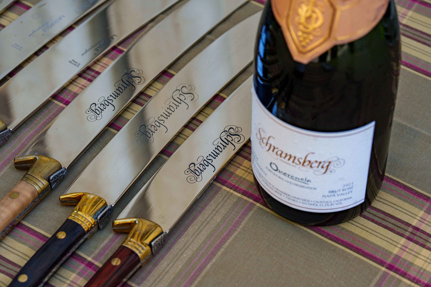 Sabering, or sabrage, traces back to the Napoleonic era, when French cavalry officers celebrated victories by striking Champagne bottles with their swords. At Schramsberg, the tradition has been reshaped into a ritual “blessing of the grapes.” A bottle is sabered into the air, then its foamy contents poured over the first bins of fruit. It’s a gesture meant to bring good fortune and to bind the moment with history.