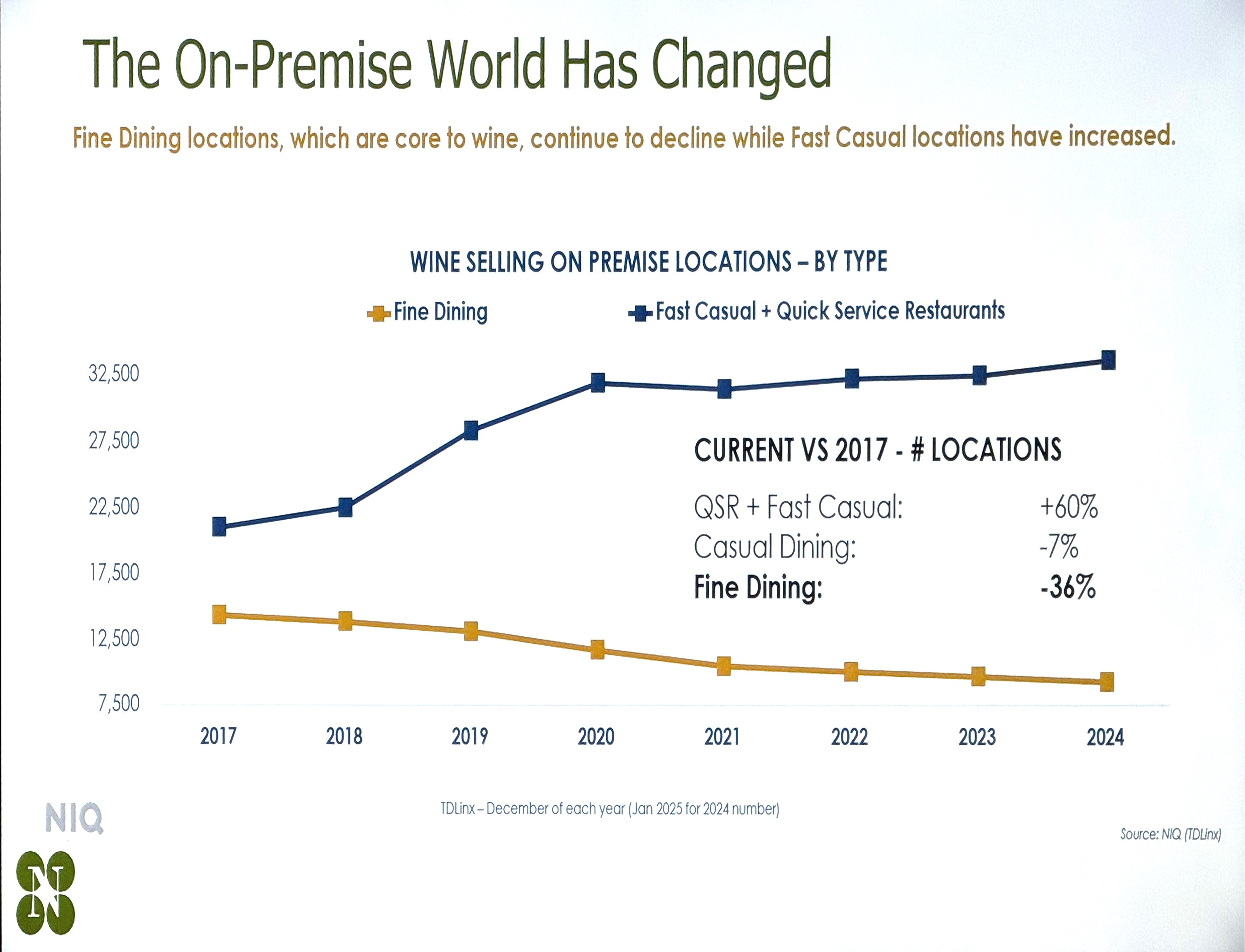 At the same time, the on-premise world has tilted away from wine. Since 2017, fine-dining establishments — historically the backbone for high-end bottles — have fallen 36%, while fast-casual and quick-service restaurants grew 60%. Casual dining is down 7%. In short, wine’s best showcase is contracting while fewer wine-friendly venues are expanding.