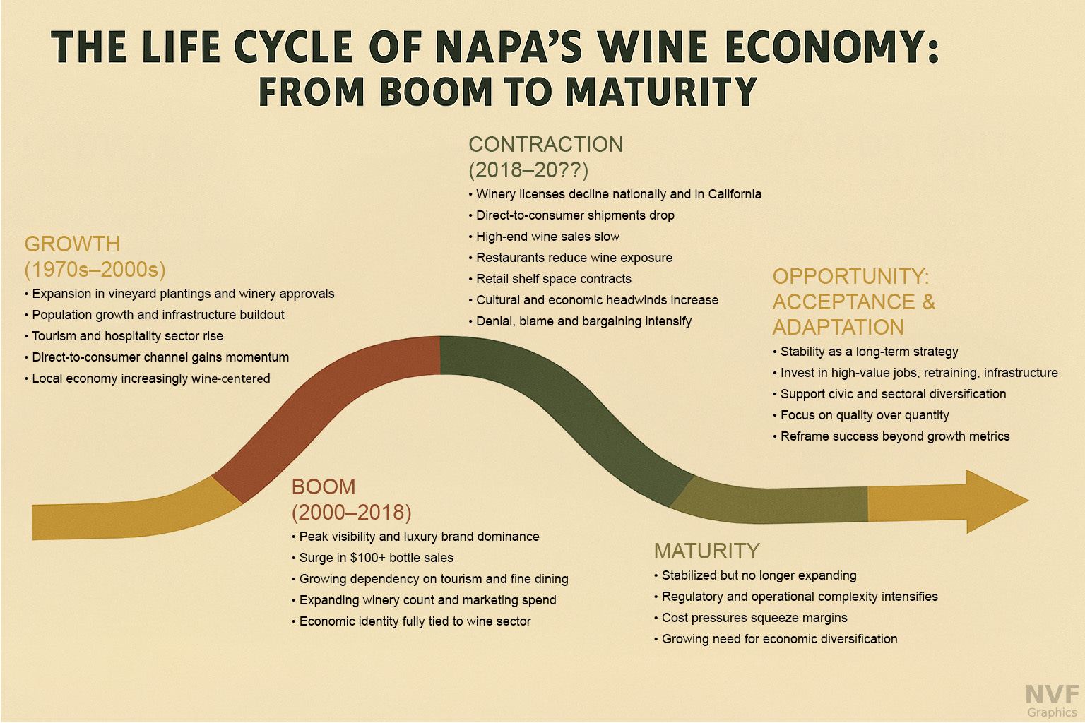 The wine-boom years are over. That’s what the data show. Napa now has the opportunity to move into the acceptance phase of this predictable cycle — to adapt rather than deny, to focus on quality over quantity and to stabilize at a level that sustains the community.