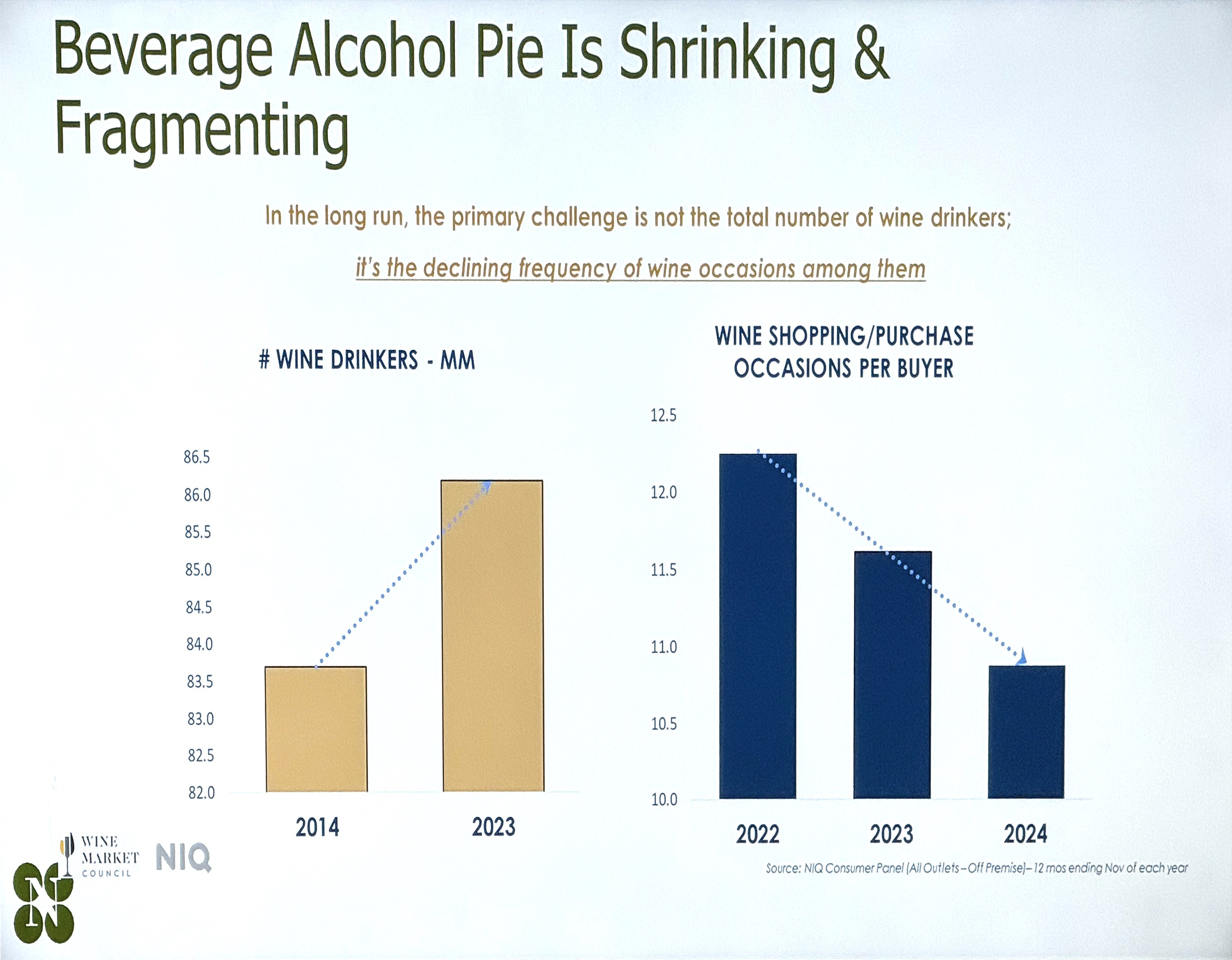 Behind those headline numbers is a more sobering reality: The beverage alcohol “pie” is shrinking and fragmenting. The number of wine drinkers in the United States has held steady and even grown by their calculations (Note: Napa Valley Features has shown that the numbers of wine-preferring adults has actually decreased in recent years, see, “Under the Hood: As America Drinks Less, Napa Feels the Squeeze”), but even so they show that the wine-buying frequency has dropped sharply. Average annual purchase occasions fell from 12.1 in 2022 to 11.3 in 2023 and are projected to dip below 10.6 in 2024.