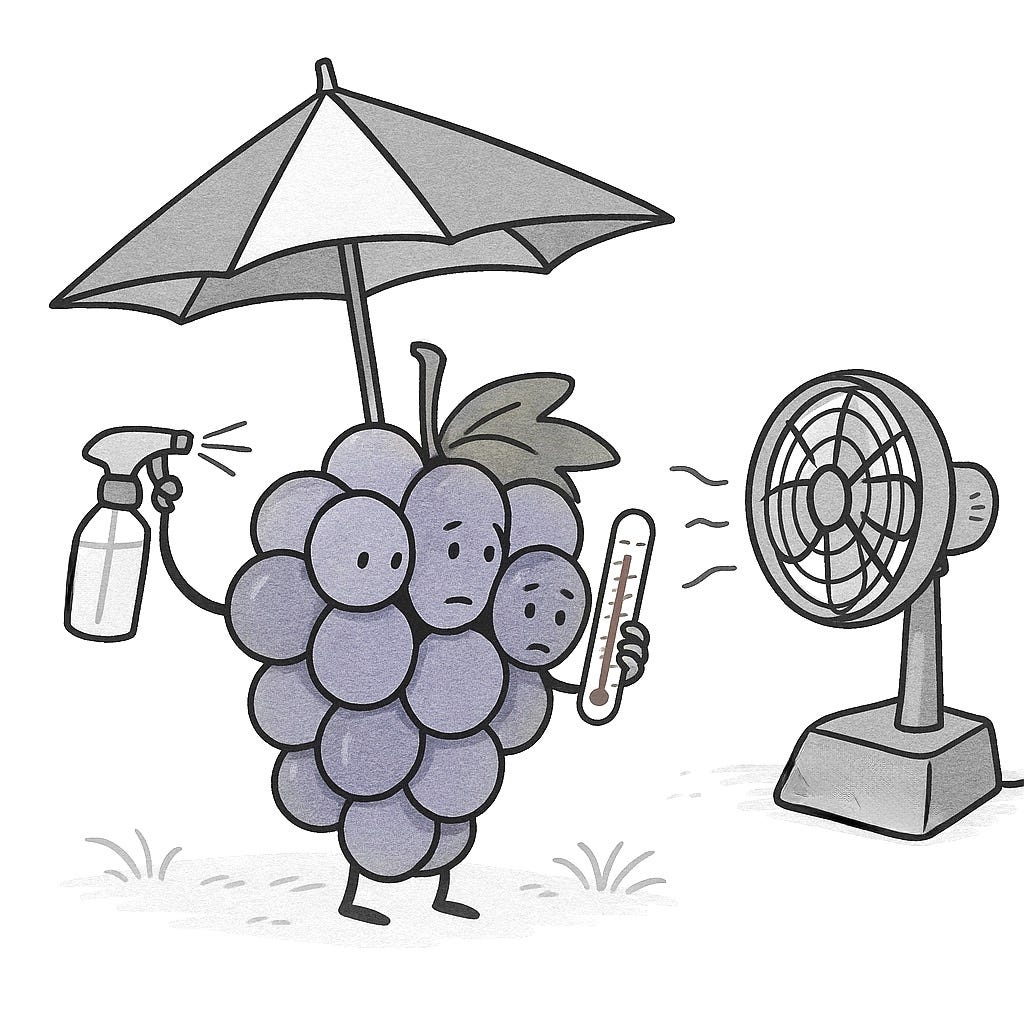 The control group (vines that were not cooled) produced wines with higher tannins and lower acids. Meanwhile, misting over the vine and inside the canopy separately produced cooler fruit and seemed to benefit wine quality. Both misting methods had benefits and drawbacks.